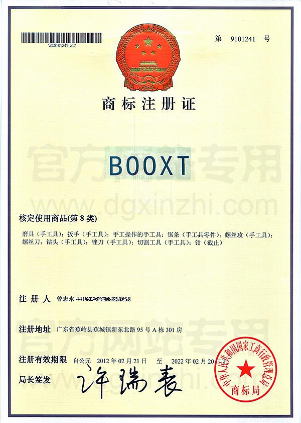 • BOOXT第8類商標(biāo)注冊證