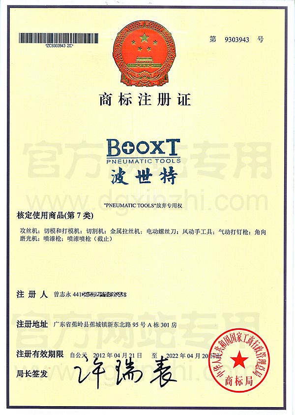 • BOOXT第7類商標(biāo)注冊證